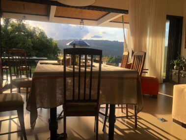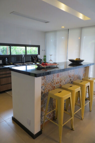 O amplo salão conjuga estra/ home theater, jantar, cozinha aberta conectada à varanda gourmet e ao gramado com vista espetacular para área de preservação ambiental bem a frente. Devido às proporções dessa sala optei por um teto mais alto do que o convencional e investimos num bom projeto de iluminação.