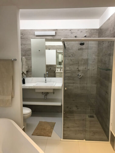 Todos os 3 quartos são suítes sendo que a suíte master possui um closet e o banheiro é duplo- um lado dele e outro dela.
